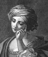 The woman wears an uncommon oriental headdress and rests her arm on a table, near an inkpot, a sheet of paper, a pair of compasses and a book. The book is entitled Sibilla frigia: in Varro's tradition, the sybils were ten women endowed with the faculty of foretelling, and among them the ninth, the Phrygian Sybil, used to tell the future in Ancyra.