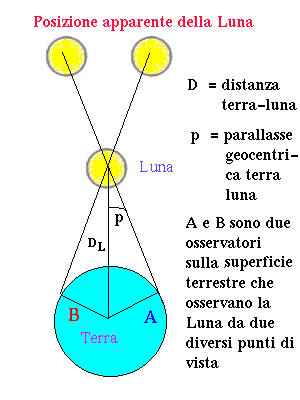 Se scegliamo il raggio terrestre (Rt= 6378 km) come base per il calcolo della parallasse (diamo quindi per scontata la conoscenza della sfericità della Terra) ecco che siamo in grado di determinare, calcolata la parallasse geocentrica P, la distanza della Terra, ad esempio, dalla Luna secondo la formula: