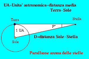 Infatti misurato l'angolo P" in secondi di arco della parallasse stellare della stella osservata su base annua è possibile immediatamente trasformarla in distanza in km: