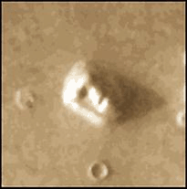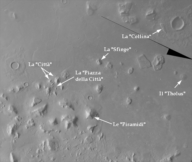 Regione Cydonia immagine ripresa dal Viking 1 Orbiter nel luglio del 1976. Questa immagine mostra la famosa "faccia di Marte" che molti scrittori hanno ritenuto una prova di vita intelligente su Marte. Molto più probabilmente si tratta di una collina nelle pianure del nord che è stata erosa così da darle una apparenza di faccia. Sotto la stessa immagine vista da altre due prospettive (ricostruite al computer): illuminata da Nord e da Sud. Un'analisi dettagliata della regione Cydonia in base alle recenti osservazioni effettuate con il Mars Global Surveyor sconfessa la possibilità dell'esistenza su Marte di strutture artificiali.