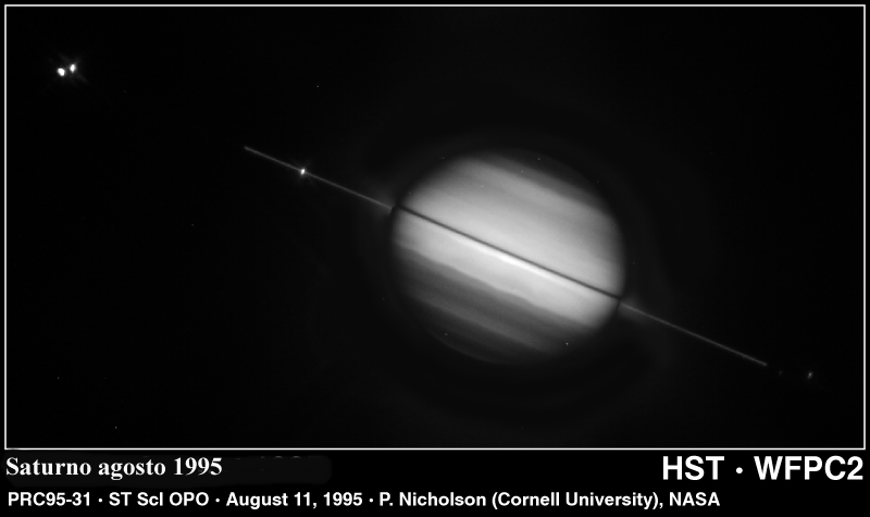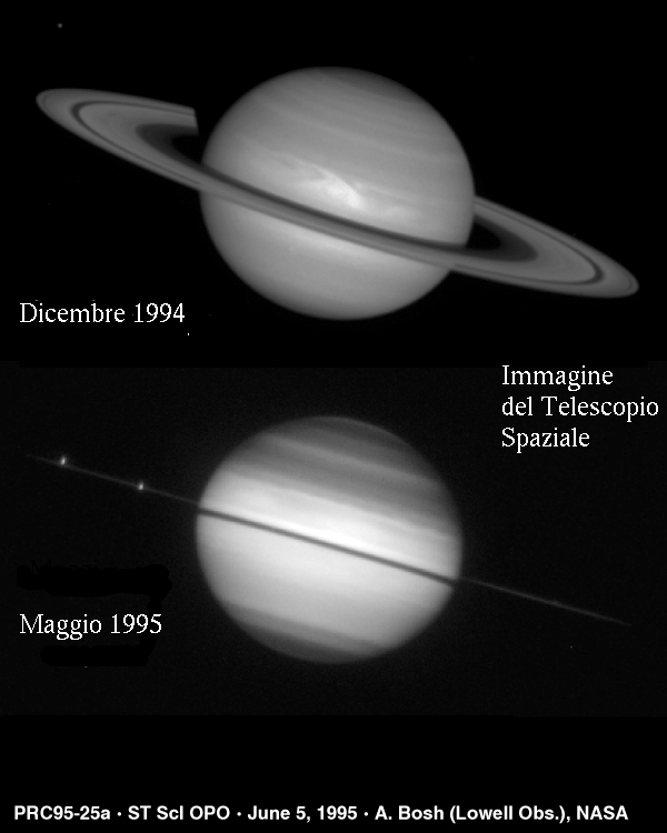 1. Saturno ed i suoi anelli visti di taglio in un'immagine ripresa dal Telescopio Spaziale il 22 maggio del 1995. Questa configurazione appare così vista da Terra solo ogni 15 anni. Cortesia S. Bosh (Lowell Observatory) ed STScI Space Science Telescope Institute.