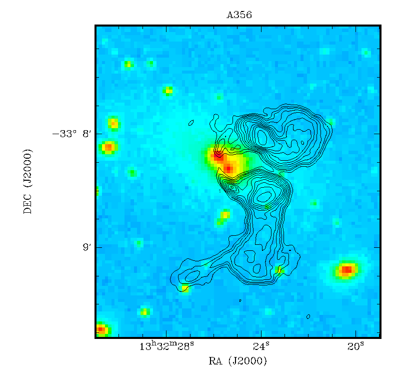The radio isophotes are superimposed on the optical image of the center of the cluster A3560 in the Shapley Concentration. Note the presence of an extended radio source, having the origin from the central galaxy which dsiplays a double nucleus. In this region it is possible to find a lot of interesting dynamical phenomena like this.
