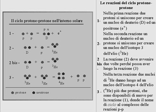 Nell'interno del Sole avviene,anche oggi, la fusione di quattro nuclei di idrogeno (protoni) in un nucleo di elio, secondo lo schema della figura 5. Il nucleo di elio ha un difetto di massa m di 0,007 rispetto alla somma delle masse dei quattro nuclei di idrogeno. Su questa base è facile calcolare, dalla legge di Einstein, che, se solo un decimo della massa di idrogeno contenuta nel Sole partecipa alle reazioni termonucleari per formare elio, si sviluppa un'energia di 9,2·1043 joule, la quale, consumata al tasso di 3,86·1026 J/s (che rappresenta la luminosità solare), risulta sufficiente per circa 7,5 miliardi di anni, ben oltre l'età della Terra.